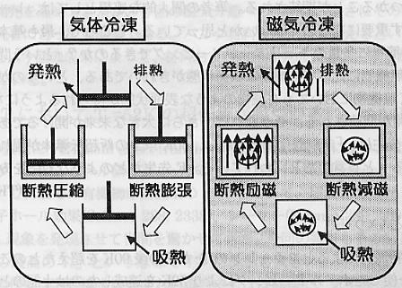 気体冷凍技術では、気体を圧縮・膨張する際、損失が発生する。一方、磁気冷凍技術は、固体である磁性体に磁界変化を与えることで一様かつ瞬時に温度変化が得られるため、理想的な冷凍サイクルに近づけることが可能となる。
