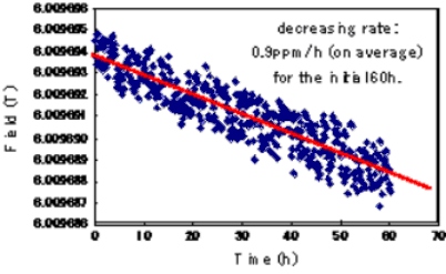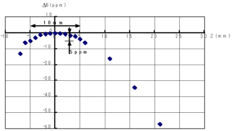 今回完成したマグネットは、従来の液体ヘリウム冷却型NMRマグネットと同様に磁場の2次4次の不均一成分を補正するコイルを備えることにより空間的な磁場均一度を高め、さらに熱式永久電流スイッチを備えると共に超電導線の接続部に超電導接続を採用することにより永久電流運転時の時間的な磁場安定度を高めている。その結果、下図に示すように、10mm領域での軸上磁場均一度は5ppm以下、1時間当たりの磁場安定度は1ppm以下を実現した。これらの磁場均一度、磁場安定度はNMRプローブを用いて測定されたものである。