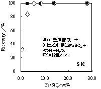 これら担磁した無機微粒子(SiC)を磁気分離で回収するモデル実験を行った(水に懸濁させて実施)。図1にコロイド化学的な手法で担磁したSiC粒子(平均粒径約12μm)をサマリウム・コバルトの永久磁石で回収した結果を示した。横軸はSiCに対する(水)酸化鉄超微粒子中の鉄のSiCに対する重量分率である。適切に担磁すると、約5%程度の担磁でSiCは100%の回収が可能である事が理解できる。また図2にメカノケミカルに担磁したSiCを3Tの超電導磁場を利用して磁気分離を試みた結果を示した。この図から明らかなように、担磁したSiCを100%回収することができることが明らかになった。これらの基礎的な検討から、コロイド化学あるいはメカノケミカルな手法いずれの方法を用いてもSiCに担磁することができ、かつそれを利用してSiCを磁気分離できることが明らかになった。これらの基礎データから廃棄スラリーの再生の可能性が見い出された。