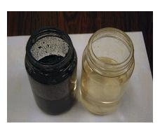 懸濁液(左)とその磁気分離後の懸濁液(右)