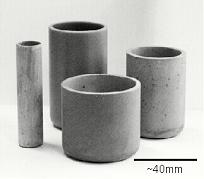 一昨年度、科学技術振興事業団の独創的研究成果育成課題事業への参画を機会に同社はBaZrO3製品の本格的な開発に乗り出し、一次粒径が0.5mm以下のBaZrO3仮焼粉末を任意の形状に成型した後、1700℃以上の高温、還元雰囲気下での長時間焼結によって、相対密度99%以上、細孔径が1mm以下という緻密な焼結体の作製に成功した。これによって昨年度より写真に示した様々な形状のBaZrO3坩堝のサンプル提供が始められたが、早速、先月の応用物理学会において、12mm角の大型Y123単結晶育成(東工大、山内尚雄教授らのグループ)、1.5mm角のHg(Re)1223単結晶育成(岸尾グループ)など新しい成果が報告された。開発と試用に携わってきた下山淳一助教授(東京大学)によれば、RE123系の溶融凝固バルク体の作製においてもBaZrO3製台座を用いることによって底面までRE123結晶が発達するとのことで、この方面への応用も期待できる。今後の課題は量産化した際の品質の維持であるが、これについて開発担当者の内藤恭吾氏(ティーイーピー社)は「品質を左右するのは仮焼粉末の性状で、その大量作製プロセスの最適化を進めており、確実に製品の信頼性が向上してきた。」とコメントしている。なお、本製品についてはティーイーピー社のホームページ(http://www.tepceram.co.jp/)にて公開されている。