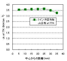 作製した3インチHoBCO薄膜(約0.8 μm膜厚)の径方向のJc分布測定から、液体窒素中で4〜5 MA/cm2の良好でかつ均一なJc分布が誘導法で確認されている。また作製した試料について通電法と誘導法の両測定方法によりJcを比較している。通電法では、試料を2 mm幅にパターニングして測定している(Jcの定義:1 μV/cmの電界が発生したときの試料単位断面あたりの電流密度)。試料の同一箇所を通電法と誘導法でJcの値を比較しており、Jcが低め(1〜2 MA/cm2)の試料では、誘導法のJcに比べて通電法のJcが低い傾向がみられるが、Jc(77 K)が3〜5 MA/cm2の試料では両測定法によるJcが同レベルの値が得られたとしている。通電法で得られた最高のJcは、Jc(77 K)=4.6 MA/cm2であり、膜厚0.8 μm、幅2 mmの試料断面に臨界電流値75 Aの直流通電を確認している(1cm幅あたりに換算すると臨界電流値375 A/cm)。さらに、3インチ膜試料全面に幅6 mmにパターニングした経路を作製し交流通電試験を行った結果、300〜400 Aのクエンチ電流を確認できたとしている(1cm幅あたりに換算するとクエンチ電流値500〜670 A/cm)。
