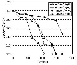 水分による耐久性試験に用いた薄膜試料は、3インチ径のLaAlO3単結晶基板上に成膜したYBCOおよびHoBCO超電導薄膜。薄膜試料は高温高湿(温度:60℃、湿度:70%)の状態に保った恒温恒湿槽の中で保管し、Jc(77 K)の変化を調査した。YBCOとHoBCOの両薄膜をそれぞれ表面保護(フォトレジストを使用)の有無を変えて実験を行っている。実験結果から、フォトレジストによる表面保護の有無の比較では、表面保護が超電導薄膜の劣化に対して非常に有効であることを確認している。またYBCOとHoBCOの物質間の比較では、HoBCO薄膜の方が水分による耐久性に優れるという結果を得ている。