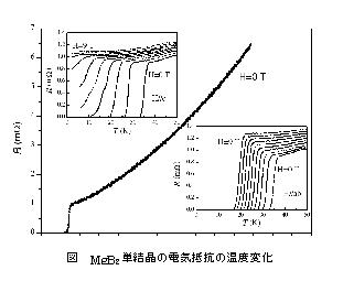 いち早く単結晶の育成に成功したのは、物質材料研究機構の徐らのグループであった[1]。彼らは、高融点金属であるモリブデン坩堝の中に、MgとBの単体原料を封じ込めて、1500度で焼成するという手法によって、0.5x0.5x0.02mm大の単結晶を得ることに成功した。電気抵抗の温度変化を図に示す。超伝導転移温度はTconset=38.6Kとバルク試料と同様の値を示した。磁場をab面内とc軸方向に印可した場合で、抵抗の振る舞いに顕著な違いが現れている。求めた異方性はγ=2.6と、薄膜で得られた値より大きいものとなった。さらに、超伝導工学研究所のLeeらも高圧合成の手法を用いて単結晶の育成に成功した[2]。彼らの求めた異方性はγ=2.7で、徐らの値に大変近いものであった。高温超伝導体に比べると、MgB2の異方性はそれほど大きくはなく、多結晶を用いる超伝導線材の開発にとって大きなメリットといえよう。