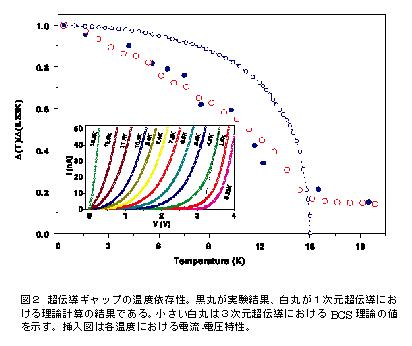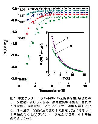 香港グループはナノチューブにおける超伝導の証拠としてマイスナー効果、超伝導ギャップおよび電気伝導率の温度依存性をあげている。1次元の場合には巨視的な(長距離秩序ともいう)超伝導は絶対零度においてのみ実現される。絶対零度から平均場の転移温度Tc0までの温度範囲では、超伝導は完全に破壊されるわけではなく短距離秩序としての超伝導が実現され、様々な超伝導を特徴付ける現象は強い超伝導揺らぎによって支配される。図1がマイスナー効果を示す帯磁率の測定結果であり、通常の3次元超伝導体では帯磁率がTc0で不連続に変化するのとは対照的に、緩やかな温度変化を示している。1次元の場合の揺らぎ超伝導にみられる帯磁率の理論計算とも良い一致を示し、平均場の転移温度はTc0 = 15 K 、さらに(絶対零度における)磁場侵入長は39オングストロームと見積もられた。磁場侵入長はナノチューブの直径より十分短いため、磁場が完全に排除されることはない。さらに、理想的な1次元伝導体では(当然ながら)電子は軸方向にのみ運動することができる。したがって軸方向に磁場を印加しても遮蔽電流は流れ得ず、マイスナー効果は起こらない。実験結果もこれと矛盾しない。さらに電流-電圧特性から見積もった超伝導ギャップも1次元揺らぎに特徴的な温度依存性を示している。これまでに有機超伝導体における擬1次元超伝導は報告されていたが、これほど見事な1次元超伝導を示す物質は存在しなかった。ゼオライトをスペーサーとして用いることによって隣接するナノチューブ間の相互作用を断ち切ることができたことが、この実験の鍵となっている。