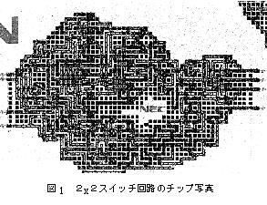 セルベースによるSFQ回路設計を支援するためにCAD(Computer Aided Design)ツールの開発を同時に進めている。開発したCADツールには、高速なSFQ回路特有のタイミング設計を行うために、新規に開発した遅延解析プログラムが組み込まれている。セルベース設計手法とそれを支援するCADツールにより、2入力2出力のスイッチの設計・レイアウトを行った。このスイッチは、アドレスの解読と衝突の検出を行う機能を持っており、衝突が起きないように自律的に経路を決定できる。図1はそのチップ写真である。回路の大きさは縦1.5ミリメートル、横2ミリメートルである。回路は約2400のジョセフソン接合で構成される。ディジタルシミュレーションにより、配線遅延も考慮して正しく動作することを確認している。