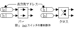 2x2スイッチは、入力された二つのパケットのへッダを読み、へッダに書かれた出力先アドレスをデコードしてパケット交換を行う(図1)。出力先アドレスが同一の場合、つまりパケット衝突が起きる場合、スイッチは衝突を検出し、パケットのへッダに衝突が発生したことを記録する。アドレスのデコード機能をもつ2x2スイッチは自律的に経路を決定できるので、この2x2スイッチを多段に接続するだけで、多入力のスイッチを構成することができる。