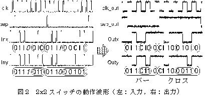 図2に2x2スイッチの動作波形を示す。信号sep、sep_outによって入出力パケットが区切られる。入力パケットの左から4ビット目が出力先アドレスである。はじめの二つの入力パケット0110010、 0111011はそれぞれの出力先アドレスが0と1であることから「バー」のパケット交換を行う。次の二つの入力パケット011100011、 011000101は出力先アドレスが1と0であることから「クロス」の交換を行う。動作波形が示すように、出力アドレスに従ったパケット交換が行われている。尚、デコードに用いたアドレスビットはスイッチで消去され、出力パケットに現れない。