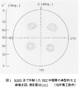薄膜線材の発表はエネルギー環境技術研究所超電導研究部の種子田賢宏氏によって行われた。新しい成膜方法として「Reverse ISD法(RISD法)」が開発され、この手法によってISD法で成膜したときに発生する基板法線に対する結晶のずれ角度が従来の7゜程度から2゜程度に低減された。また、RISD法で成膜した中間層上にキャップ層を通常のPLD法で成膜すると、キャップ層の面内配向性がISD法で成膜した中間層上のそれに比べて向上することが見出された。同社では従来より東京電力と共同でISD法による金属基板を用いた薄膜線材の開発に取り組んでおり、H11年度からは両社共同で国家プロジェクトに参画し、ISD法の開発に注力してきた。ISD法は基板を傾けて成膜するだけで簡単に面内配向が得られるという特徴がある一方、高配向化に向けて二つの大きな課題があった。一つは、基板を傾斜させることに由来する基板法線に対する結晶配向のずれの存在、もう一つは20゜程度とやや大きい面内配向性である。例えば、中間層としてよく用いられる立方晶のYSZの場合、<100>はほぼ基板法線の方向と平行になるように配向するが、<100>と基板法線との間には7゜程度の結晶ずれ角度が存在し、ずれの方向は基板へのプルームの入射方向と逆の方向に現れる強い傾向があった。そこで、中間層の設計膜厚の1/2を従来のISD法で成膜した後に、基板を逆方向に傾けて残りの1/2を成膜することで結晶ずれ角度をキャンセルし、2゜程度に低減することに成功した。言われてみれば当たり前に思われる、このコロンブスの卵的な手法は「Reverse ISD法(RISD法)」と命名された。RISD法によりJcは従来比の約2倍に向上したという。また、キャップ層の下地としてRISD法で作製した中間層を用いたところ、キャップ層の面内配向性が向上する傾向が得られた。これらの手法の組み合わせにより、ISD法の課題であった基板法線に対する結晶配向のずれとやや大きい面内配向性とを解決する手がかりになると期待されている。