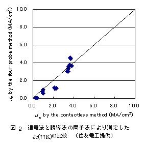 また作製した試料について通電法と誘導法の両測定方法により同一箇所のJcの比較をしているが、両測定方法で同等の値を確認している。またHoBCOとYBCO表面抵抗についても調査をしている。Jcが高い試料はHoBCOでもYBCOでも低くなる傾向が見られている。HoBCOとYBCOの材料による比較では、HoBCOの方がYBCOよりも低い表面抵抗(60 KではRsは約3 mΩ)が得られたとしている。さらに母倉氏によれば、最近LAO単結晶基板のみならずマイクロ波フィルター用途や限流器用途などの実用化でも有望視されているサファイア基板上でも成膜を行っており、JcとしてMA/cm2クラスのものを得ている模様。その内容については、今年11月23〜25日に福井工業大学で開催される秋季低温工学・超電導学会で発表予定とのことである。