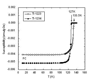 常盤和靖氏(現在東京理科大渡辺恒夫研究室助手)らは、高圧合成されたTl-1234系超伝導体がTc〜126Kまで上昇することを示した。田中浩介氏と田中康資氏(産総研伊原グループ)らは還元アニーリングによってTl-1223系のTcを130K以上にまで引き上げることに成功した。高圧下で試料を合成することにより、BaおよびCaサイトへのTl置換が抑制されてポテンシャルの乱れが取り除かれ、その結果この系の持つ本来のTcが引き出されたのだろうと伊豫彰氏(産総研伊原グループ)は述べている。高いTcを再現性良く得るための試料作製条件も明らかにされており、現在Tl-1223でTc=133.5K、Tl-1234でTc =127Kが得られている(図1)。