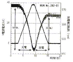 原研の寺門恒久氏ほかの報告書「JT-60電源を用いたITER中心ソレノイドモデルコイルのパルス通電試験」JAERI-Tech2001-056,2001.8より転載させていただいた。コイル電流が見事な直線で立ち上がり、下がっているがその陰でフライホイール付発電機が回転エネルギーの充放電を繰り返して頑張っていた様子が図1に記録されている。