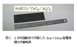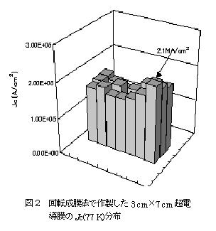 2次元揺動法と同時に「回転成膜法」でもSN転移型限流素子用の大面積超電導膜の開発を行っている。回転成膜法は、これまで主として超電導マイクロ波フィルター用等のデバイス薄膜用に開発されてきている。本手法によれば、ターゲット上でのレーザ光の形状やエネルギー密度が変化せず特性の面内ばらつきを抑えて均一な薄膜の形成を達成している。回転成膜法では、これまでに3 cm×7 cmサイズのサファイア基板上のHoBCO大面積膜を作製しており、均一な膜厚分布をもつ試料が作製され、77 Kで約2 MA/cm2の均一なJc特性が確認できているという。また、最新のデータとして注目すべき点は、通電特性として1 cm幅あたり約180 AのIc(77 K)を達成していることである。これは、1 MA/cm2以上のJcを維持しつつ、従来サファイア基板上の超電導膜では困難であった約0.7 μmの厚膜化(これまで典型的には約0.3μm)が実現できたことによる。このように大電流通電が可能になったことにより、今後の限流器用途をはじめとする電力用途の実用化が大きく期待できるといえよう。最新のデータについては1月24、25日に電力中央研究所で開催された電気学会超電導応用電力機器・リニアドライブ合同研究会で発表された。