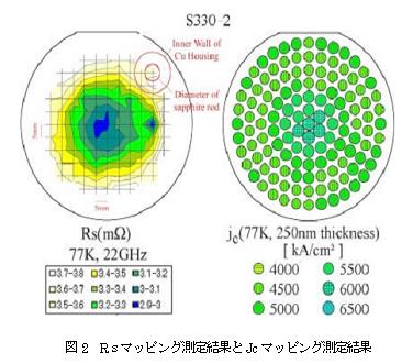 図2(左)に、測定された3インチ丸のYBCO薄膜のRsマッピングを示す。測定周波数は22 GHz、測定温度は77 Kである。Rsの値に対応してカラー表示され、薄膜面内のRsの均一性、不均一性がすぐ分かるようになっている。また、同図(右)に、同じ薄膜のJcマッピングをドイツのライプチヒ大学のローレンツ教授に測定してもらった結果が示されている (Jc -scan Leipzig)。薄膜の中央部分が他の領域よりもJcが大きくなっている。これは、表面抵抗の値が中央部分で小さくなっているのに対応しており、両者に相関があることを示唆している。