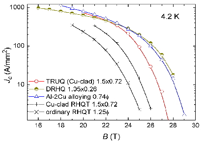 金属線材グループの伴野信哉研究員は「bcc相の規則化をバイパスするため950-1000℃まで素早く昇温しbcc→A15相で解放される変態熱を利用した高温短時間熱処理(変態熱アップクエンチングTRUQ)を行うと、積層欠陥の生成が抑制できる。Jc-B曲線の傾きが変わらずBc2(4.2 K)を29 Tまで向上できる。Cuクラッド安定化線材にも適用できて高磁界でのJc特性が大幅に改善する。」と述べている。また、同グループ菊池章弘研究員は、「reel-to-reelの急加熱急冷を2回繰り返すダブルクエンチングDRHQ法で、TRUQよりさらに高温で短時間変態処理を行うと、Bc2(4.2 K)を30 Tまで向上できる。25 Tでの化合物Jc (4.2 K)は金属系超伝導線として最高の190 A/mm2に達する。」と述べている(図2)。変態後に脆くなった線材でもreel-to-reel処理できるように、DRHQでは、1回目の急冷後にテープ状に圧延し、2回目の急冷では曲げ歪みを軽減する。しかし、そのためにIcは低く抑えられてしまう。1 GHzNMR設計担当の木吉司サブグループリーダーは「現在のコイル設計では通電容量251 A (@23.5 T&1.8 K)を満足するモノリス導体が求められている。DRHQはIcの点で上利かも知れない。しかし、4.2 Kで25 Tまで高いJcを有するので金属系としては極めて魅力的な線材である。今後の展開に十分注意を払いたい。」とコメントしている。
