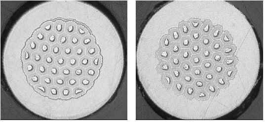 同社では古くから、核融合、加速器、NMR、物性研究等に用いられるNb3Sn超電導線材を内部拡散法により開発しており、これまでに多くの実用線材・導体を開発し、供給してきた。内部拡散法は、Nb、Sn、Cu等の純金属を原材料として用いており、加工中の焼鈊が上要で加工性と製造コストに優れている。さらに、線材内のNb、Snの配置と量を広範囲に選択することができ、線材設計によって幅広い超電導特性(Jc特性およびQh特性)を有する線材が得られるとされてきた。一般に高Jc化の手法としては、線材非銅部内の超電導体の占積率を増加させる、超電導体そのものの特性を向上させる、といったことが考えられるが、今回開発された線材は主として前者の方法で高Jc化を試みたものである。写真左の線材HJTではバリヤ材として核融合用線材と同じTaを、写真右の線材HJNではJc増加の観点からNbを用いている。両者の線材とも、Nbフィラメント、Snコアの占積率を核融合用線材に比べ40 %程度増加させている。Nb、Sn占積率の増加はCuマトリックス比の低下をもたらし加工性の悪化が懸念されるが、これらの線材においては全く問題なく加工することができた。これまでに、4.2 K、12 TにおいてHJTで1600 A/mm2を、HJNで1700 A/mm2の高Jc特性を達成している。