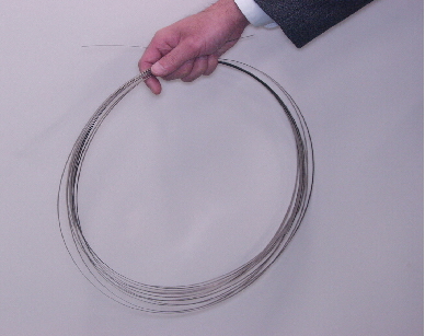 このMgB2の結晶は、ダイヤモンドのように硬く、通常の方法ではセラミックスと同様に塑性加工は困難と思われていた。しかし、この粉末を高強度の金属で被覆し、圧延などで線状に加工することにより、熱処理無しで一平方センチメートル当たり45万アンペアの高い臨界電流が得られる線材作製法を、物質・材料研究機構が開発した(2001年6月既報)。そこでは、安価な金属材料を利用でき、かつ、熱処理不要なことから、従来の超伝導線と比較して製造工程の短縮や低コスト化が期待された。その成果を受けて、日立研究所では、独自に特殊な圧延加工法により、MgB2圧粉体を高密度で連続的に流動させる技術を開発し、10 m級の長尺線材の製作に初めて成功し(図1)、更に、この線材を用いてコイルを製作し、初めて磁場発生を確認できたという(図2)。