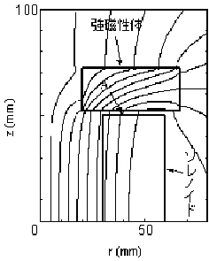 Bi2223銀シース高温超電導テープ線材を液体窒素温度で利用することが研究されている。この線材は磁気異方性を有し、テープ面に垂直に磁界が印加されると臨界電流が急激に低下する。このテープ線材を用いて空心ソレノイドを製作した場合、ソレノイド両端部の線材には面に垂直に磁界が印加しこの部分の臨界電流が低くなるため、この特性が重大な問題となる。産業技術総合研究所超電導応用グループ(梅田政一主任研究員,近藤潤次研究員、古瀬充穂研究員)は、以前より強磁性体ディスクをソレノイド両端部に配置することで、この向きの磁界を低減できることを、数値計算により示してきた。今回、Bi2223線材を導体とする10枚のダブルパンケーキからなる、内径60 mm、外径120 mm、高さ100 mmの高温超電導ソレノイドを製作し、また内径40 mm、外径134 mm、厚さ20 mmの強磁性体ディスクを2枚用意した。そして,ディスクをソレノイドの両端から2 mm離して配置した場合としない場合の2ケースについて、77 Kにおける最端部のダブルパンケーキの直流での平均臨界電流(1mV/cm×(巻線材長)の電圧が発生する電流)を測定した。その結果、強磁性体ディスクを配置することで、平均臨界電流が3割増加した。また、図は強磁性体を配置したときのソレノイドと磁力線を示したものであるが、図中A点における径方向(テープ面に垂直な方向)の磁界成分を小型ホール素子を用いて測定した結果、強磁性体ディスクを配置することで約1/6に低減できていることが明らかになった。表はこれら測定結果を示している。
