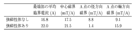 表1 強磁性体の有無による臨界電流と磁界の変化