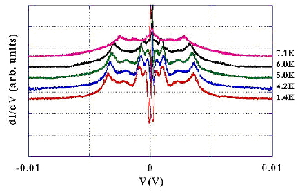 図2 Pb/MgB2接合の特性。D(MgB2) + D(Pb)以下でアンドレーフ反射によるdI/dVの増大が観測される。また、低バイアス側で多重反射によると思われる微細構造が重畳している[3]。