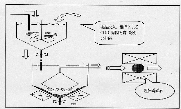 磁気分離手法を用いたフェライト化処理法による重金属含有廃水処理技術は環境保全の効果的な手法の一つであり、アルカリ水溶液中に各種重金属イオンと鉄イオンを共存させ、酸化することによりスピネル型フェライトとして担磁し、磁気分離によって廃水を浄化するものである。このプロジェクトでは、この重金属イオンの代わりに、水に懸濁、あるいは溶解している非磁性物質である有機物を担磁させて磁気分離する廃水処理法を開発している。言い換えれば、化学的手法による担磁(コロイド化学的担磁法)と物理的手段による分離(超伝導磁気分離)を行うことが特徴で、製紙工場から処理されてきた原水(化学的酸素要求量:COD = 150 O2mg / L)にマグネタイト、硫酸鉄、アルカリ水溶液を撹拌しながら順次加えることによって得られる処理水のCODは20 O2 mg / L付近まで下がることが確認されている。現在、一日500トンの廃水処理のシステムを構築するための基本設計が行われている。