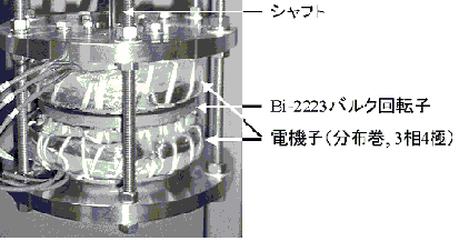 バルクモータの研究には一般にイットリウム系材料が使用されており、無負荷状態では同期速度やヒステリシスモータ的定トルク特性が得られている。一方、ビスマス系超伝導バルク体をモータ用回転子に適用した場合、液体窒素冷却程度の高温度領域では弱いピン止め力を反映して滑りを生じ、同期速度には達しないと過去の実験的研究から考えられていた。また、回転磁界中におけるバルクの電磁特性とトルク発生機構の関係も明らかでない。そこで、同研究グループではBi-2223バルク回転子の基礎的電磁特性と、同回転子を適用したモータのシステム特性両面から研究を進めている。今回、空隙磁束密度の空間高調波成分を抑えるために分布巻電機子巻線(図1)を用い、また、バルク材のピン止め特性とモータ特性の関係を系統的に調べるため、ロータリー真空ポンプで液体窒素を減圧して温度を変化させ、詳細な試験を行った。その結果、温度を64 K程度まで下げ、電機子電流Iaを適当な範囲に設定することで同期速度回転ならびに定トルク運転が可能なことを突き止めた。電機子電流がこの範囲より大きくても小さくても同期しない(図2)。一方、77.3 Kでは同期速度に達する電機子電流値は存在しなかった。この原因として、電機子電流が小さい時にはトルクを発生するだけの十分な磁束侵入が起こらず、また大きすぎると磁束フローによってバルク回転子が一次側回転磁界に対して相対的速度差(すべり)を生じてしまうと考えられる。現在、この興味ある結果からさらにバルクの電磁的挙動に関心を寄せ、詳細な検討が進められているところである。また、同期化力の向上に注目した研究も必要と認識されている。