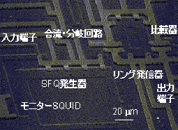 SFQ(単一磁束量子)回路は超電導の特徴を巧みに生かしたデジタル回路であり、半導体回路では実現できないレベルの超高速の信号処理を可能にするものと期待されている。SFQ回路では、磁束の最小単位である磁束量子が回路内の特定部分にあるかないかで「1《、「0《の情報を識別し、ジョセフソン素子を通して磁束量子の出入りを制御することで情報処理が行われる。また、磁束量子の出入りの際にはジョセフソン接合に一定の大きさの電圧パルスが発生するため、このパルスを検出することで処理された信号を外部に取り出すことができる。
