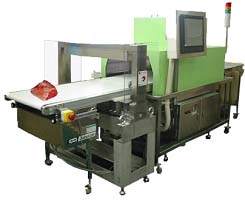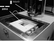 アドバンストフードテック(豊橋市)は、食品、特に食肉に混入する金属異物の検査装置として、高温超伝導SQUIDの利用を目指した開発を進めている。アドバンストフードテックの富川達也氏によると、これまでの金属探知機では、食品の水分状態や塩分濃度などにより装置の調整が必要であり、また感度も必ずしも十分とはいえなかった。しかし、SQUIDを用いるとこれらの影響がほとんどなくかつ高感度化が期待できるという。すでに本格的な装置の試作が進められている。平成15年2月12日から14日までビックサイトで開催された国際食肉産業展には、図6の食肉用異物検査SQUID装置が展示され注目を集めた。加工された部分肉を非磁性のベルトコンベヤーに乗せて、まず手前の磁化コイルを通し、垂直方向に磁化させた後、磁気シールド内に搬送する。SQUID(住友電工ハイテックス製)は磁気シールド内に設置されており、異物を検出することができ、連続した検査が可能となっている。この装置は食肉加工工場に設置され、従来装置を上回る検出感度を達成しており、平成15年度には商用機を仕上げる予定とのことである。最近では、食の安全が強く意識されるようになっており、多様な食品検査においても利用されることが期待できる。