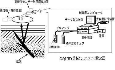 地上に数10m角または円のコイルを設けて電流を流し地下に向けて磁場を印加しておき、電流を遮断すると、地下には磁場の遮蔽電流が発生し、地下の電気抵抗により減衰する現象が起こる。探査法の概念図を図3に示す。この電流の減衰を磁場の減衰として観測し、地下の電気抵抗を得ることができる。従来は、センサとして誘導コイルが用いられていたが、低周波に対する感度が低く深部探査が難しかった。これに対しSQUIDでは、低周波でも高感度を維持できるため、深部鉱床探査が可能となる。