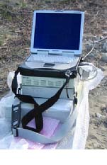 SQUID金属鉱床探査装置は、すでに住友電工ハイテックスにより試作されている。図4にはSQUID磁気検出部を、また図5にはSQUID電子機器およびデータ収録装置の写真を示す。野外での探査を必要とするため、バッテリーによる動作が可能となっている。SQUIDは液体窒素冷却動作である。すでに国内数箇所において断層調査などの試験を繰り返しており、金属鉱床探査装置としての機能確認が進められている。金属鉱業事業団技術開発部探鉱技術開発課の荒井英一氏によると、平成15年度にも最終的な実用機を仕上げる予定とのことである。野外におけるSQUIDの応用は、高温超伝導SQUIDの開発により、はじめて実用の可能性が見出せたものであり、野外応用の多様なSQUID応用の可能性を示した点でも今後期待が持てる。