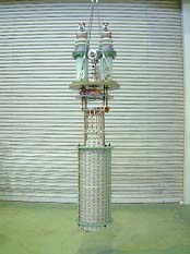 富士電機では、これまでに九州大学、九州電力と共同で、Bi2223超電導巻線をサブクール液体窒素で冷却する方式の6.6kV/3.3kV-500kVA超電導変圧器を1996年に、22kV/6.9kV-1MVA器を2000年に開発している。本事業では、さらに高電圧、大電流容量化技術の開発を目指して研究を行っている。66kV、77kV階級では160kVの交流過電圧、400kVの雷インパルス電圧に耐えなければならない。高電圧化に関しては、まず、平成12年度に実施した66kV/6.9kV-10MVA器の概念設計に基づいて、ターン間、層間、一次-二次間を模擬した各種絶縁モデルコイルを設計、試作し、66Kのサブクール液体窒素中で耐電圧試験を実施して巻線絶縁技術を検証した。さらに、電流リードの高電圧化対策として、一次側用に66~77kVレジン含浸型コンデンサブッシングを開発し、絶縁モデルコイルと同様に各種耐電圧試験を実施して絶縁特性を検証した。大電流化技術については、10MVA器の二次巻線の定格電流が483A(二次側Δ結線にて線電流は837A)となることから、Bi2223線材を20並列(10並列×2条巻)導体として内径f330mmのモデルコイルに19回の転位を施して40ターン巻き、通電、分流特性を測定して、均等かつ健全に通電しうることを確認した(図1参照)。富士電機では、10MVA器の超電導巻線における交流搊失解析も終え、従来の66kV/6.9kV-10MVA油入変圧器の搊失が約100kWであるのに対し、超電導器の場合、侵入熱も含めて45kWと半分以下(66Kでの冷却ペナルティ15倊を仮定)になると予測している。