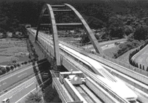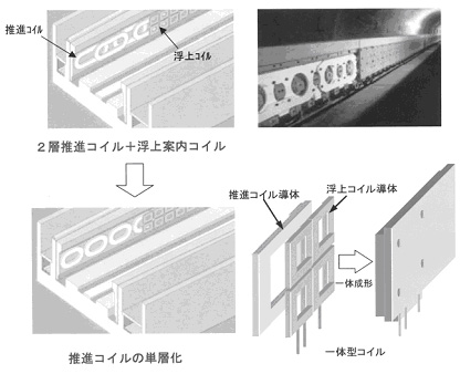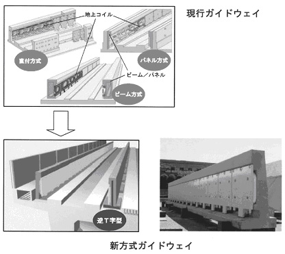 コスト低減技術の面では、新方式のガイドウェイ、新型地上コイルおよび高効率電力変換器の開発が報告された。新方式ガイドウェイは自立できる逆T字型断面形状を持っており、建設時だけでなく補正・取替といった保守においても作業性が向上するため、コスト低減に寄与するとのこと。新型地上コイルは、推進コイルが従来の2層から単層構造となり小型・単一化され、さらに浮上案内コイルと一体成形することによって、製作・取り付けコストが低減できる特長を持っている。また、リニア走行においては電力変換器によって速度に見合った周波数の電流を地上コイルに流すが、ここで使う半導体素子を従来のGTO(Gate Turn-Off thyristor)からIEGT (Injection Enhanced Gate Transistor)に置き換えたものが開発され、周辺部品数の低減による大幅な低搊失化と小型化が達成されている。