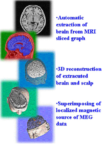 先端電子研は超電導エレクトロニクスによるシステム化技術のすべての要素技術を持ち、さらにフラックスゲート磁気センサ技術、NMR応用技術など他の分野への展開、さらに計測技術をベースにしたIT分野への拡大をも積極的に行っている。その技術開発の成果の一部は、高密度集積化SQUIDマグネトメータチップの開発、また安価なPCで簡易にMRI画像から脳の自動切り出しを可能にするフリーソフト(図1)の開発などである。とくに後者のフリーソフトは先端電子研ウェッブページで公開され、世界中からこの1年あまりで300を超えるダウンロードが行われている。