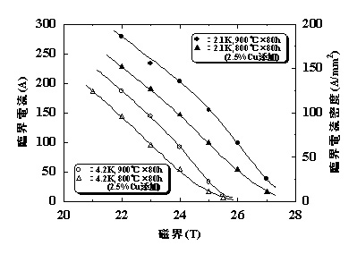 作製した線材の臨界温度(中点)は18.1~18.2Kで、歪効果に相違はあるが、実用ブロンズ法 (Nb,Ti)3Sn線材より0.5K程度高い。図1は線材の高磁界におけるIc (Jc)-磁界特性の例である。900℃×80hの熱処理を行った(Nb,Ta)3Sn線材は、4.2K,23Tで約100A/mm2のJcを示し、実用 (Nb,Ti)3Sn線材より3T程度高磁界側にシフトした特性が得られた。さらに図に示したように、900℃の熱処理線材は2.1Kでは25Tの超高磁界で100A/mm2のJcを示し、実験値をKramerプロットで外挿した上部臨界磁界BC2は28.4Tに達する。測定温度が4.2Kから2.1Kに低下するとJc*磁界曲線が約2T高磁界側にシフトする。図にはSn-Taに2.5重量%のCuを添加したSn-Ta-Cuシートを用いたJR線材のIc (Jc)-磁界特性も示した。2.5%Cu添加線材では、熱処理温度を900℃から800℃に低下出来るが、これは拡散境界の融点が低下し、低い温度でも (Nb,Ta)3Sn層の生成が進むためと考えられる。2.5%Cu添加800℃熱処理線材及び5%Cu添加775℃熱処理線材では、4.2K,22Tで約100A/mm2のJcが得られる。また、2.5%Cu添加800℃熱処理線材は、2.1Kでは24Tで約100A/mm2のJcを示す。