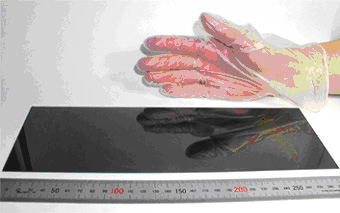 大面積超電導膜は、通信分野におけるマイクロ波フィルタ、電力分野におけるSN転移型限流器等への応用が期待されている。従来、超電導膜作製技術に関してはレーザー蒸着法等の気相プロセスを主流として開発競争が行われてきたが、気相プロセスは高コストでかつ量産化が困難という問題点があった。またサイズに関してもミュンヘン工科大の20cm×10cmあるいは20cm径円盤(中心部は非製膜)等がこれまでの最大であった。これに対し、産総研では経済産業省・交流基盤研究プロジェクトの下で、塗布熱分解法を用いた大面積超電導膜作製の研究開発を行ってきた。この方法は原料溶液を「塗って焼いて」超電導膜を作るものであり、気相プロセスと比べてはるかに低コストでかつ量産化が可能である。