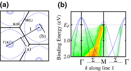 (b), 角度分解光電子分光によるバンド分散とバンド計算(実線、波線はs、pバンド)の比較