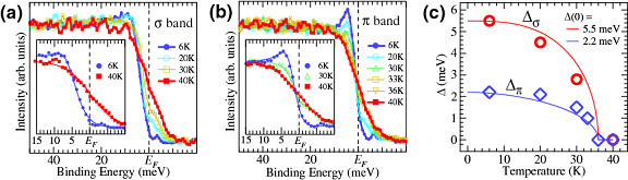 図3 フェルミ準位近傍の光電子スペクトルの温度変化(a)、(b)と超伝導ギャップの温度依存性(c)