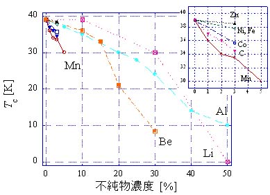 また、MgB2のキャリアはホール11,12)であるため、元素置換によるホールドープによってTcの上昇を期待することや、圧力効果の実験から格子の収縮に伴ってTcの抑制が報告されたこと13-15)を受けて、格子を積極的に広げようとすることを方針として、他元素置換が試みられた。図1に、報告された置換効果の結果を示す。これまで、Mgサイトへの他元素置換は、Li, Mn, Al等に関する報告16-19)がなされており、いずれの報告においてもTcの上昇は観測されず、他元素置換によるTcの抑制という結果になっている。しかし、Znを3%置換した系において、Tcが約0.2K上昇したという報告18)もあるが、比較に用いたMgB2のTcが若干低い(~38K)ため、今後の更なる検証が必要であると思われる。また、他の遷移金属を置換した報告18,20)もあるが、著しいTcの上昇は観測されていない。一方、Bサイトへの置換は、C, Beに関する報告がなされている。これらの元素の置換によって、Tcの低下が報告されている21-23)が、C置換においてある特定の濃度においてTcの上昇が観測されたという報告24)もある。しかし、この結果を再現する報告はなく、我々もこの結果を再現できていない。