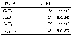 理論計算からは特にアルカリ土類金属(Na, Li, Ca等)を置換した場合に、高いTcが実現するという予測25)が多いが、実際にはアルカリ土類金属を使用した合成は困難であり、固溶系物質が非常に得られにくい。また、固溶系以外にも関連物質としてAuB2, AgB2, CuB2, LixBC(x~0.5)という化合物で高いTcが実現する26,27)であろうという、非常に魅力的な予想が報告されている(表1)。しかしながら、これまでにそのような物質の合成に成功したという報告がない(LixBCは除くが、Tcは観測されていない28))。もし合成できたらという期待感は十分残されているように思われる。