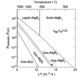 2元化合物のMgB2の薄膜合成は、4~5元化合物の銅酸化物に比べ一見簡単そうに思われるが、構成元素のMgとBの蒸気圧が極端に異なるために容易ではない。図1には、縦軸をMg分圧、横軸を温度の逆数にとったMg-Bの2元系の相図(熱力学計算による)を示した。超伝導MgB2相が得られるのは、低温/高Mg分圧領域である。相図中には、MgB2相とMgガスの共存領域があり、一見すると、GaAs成長と同様に、Mgの付着が自己調整されるような状況が期待される。しかし、基板温度が400~500℃では、MgとBが化学反応するまえに、フリーなMgが再蒸発し、基板にはボロンのみが残る。これは、図1の相図には熱力学だけが考慮され、化学反応の運動論が反映されていないためである。基板温度を上げれば、化学反応は迅速になるが、例えば600℃の基板温度ですでに、PMg = 10-3~10-2 Torrが必要となる。これをMgのレートに換算すれば、1000~10000Å/secとなり、真空蒸着では相当無謀な試みとなる。このため、MgB2発見直後は、Bプリカーサー薄膜とMg塊を石英管に封管し、~900℃の高温焼成によりMgB2膜を得る方法が採られた(2ステップ法)。得られた薄膜は良好な超伝導特性を示すものの、この成膜法では多層積層はできない。積層デバイス作製にはその場成長が必須である。MgB2の超伝導がアナウンスされて3ヶ月後、我々は分子線エピタキシー(MBE)法により、世界に先駆けてMgB2のその場成長に成功し、エレクトロニクス応用の足がかりを作った。成長のキーポイントは、低温成長(300℃以下、Mgの蒸気圧曲線による律速)と(2)超高真空(Mgの酸化防止)の2つである。低温成長のために、作製された薄膜は単結晶膜ではないが、Tc~35K程度の薄膜が得られる。MgB2の場合には、銅酸化物の場合と異なり、エピタキシャル単結晶薄膜でなくともある程度良好な超伝導特性が得られる(Nbのデバイスにも単結晶膜は上要である)。この特徴はデバイス作製には有利な点である。MBE法以外に、現在までに、スパッタ法、PLD法、CVD法によるMgB2のその場成膜が報告されている。この中で、とくに注目しなければならないのは、ペンシルバニア州立大・XiらによるCVD法によるMgB2成膜である(図2)。簡素・安価なCVDリアクターを用いて、Tc(end)が40Kを越えるMgB2薄膜を作製している。室温抵抗率8mWcm、Tc直上の抵抗率0.25mWcm、RRR~30-40というバルク単結晶を凌ぐ特性を得ている。この成膜法は、積層の可否についてはまだ疑問が残されているものの、少なくとも単一膜作製には非常に有望な手法である。