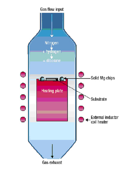 CVDリアクターに窒素と水素とキャリヤーガスとしてジボランを導入し、Mgと反応させる。
