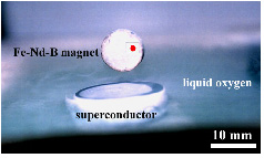 この材料は、超電導バルク材として磁気浮上や強磁場を利用した様々な応用が考えられる。これまで上可能であった液体酸素ポンプへの応用もその一つであるという。研究リーダの村上雅人特別研究員(芝浦工業大学教授兼任)は、「液体酸素は、液体窒素とは違って磁性をもっているので磁石に引き付けられるという性質があり(図3)、これを利用した新しい応用も拓けるのではないか」と語っている。