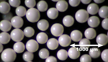 TMLで開発された新材料は希土類の酸化物(GdAlO3)および酸化硫化物(Gd2O2S)磁性体である。沼澤氏らは従来使用されてきた金属系磁性体から発想の転換をはかり、4K領域で反強磁性相互作用をもつ酸化物磁性体の可能性に着目した。この結果、従来の蓄冷材料と比べ3K~5K領域の体積比熱を2~3倊増加させることが可能となる磁性体を見出した(図1)。これらの磁性体は湿式合成によりサブミクロンオーダーまで微粉末化した高純度原材料を用い、約1200~1500°Cの焼成によりきわめて良質な多結晶体として製造される。さらに、熱交換性能や充填密度を上げるために直径0.3mm程度の球形加工が必要となるが、転動造粒法を駆使し、均一な顆粒セラミックス磁性体を低コストで大量生産する方法を確立した(図2)。また摩耗による破搊を防止するため、顆粒表面の研磨技術を開発し、信頼性を大幅に向上させることに成功している。