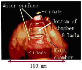 4) 超伝導マグネット中心にマウスを配置して皮下脂肪温度を計測したところ、体温が低下する現象を実験で確認した(埼玉医大 市岡助教授との共同研究)。ただし、温度変化に伴う酸素の磁化率変動で生じる対流(磁気風)の影響が否定できない等、均一強磁場と勾配磁場のどちらの影響か判断しかねるところである。生体実験ではサンプル自身が代謝活動(呼吸など)をするため、たくさんある要因を排除することが困難である。新磁気科学の目覚しい発展により生物実験に付随した物理化学的磁場効果の衣をはがすことが可能となり、今後は生物現象そのものに対する磁場効果の厳密な検証について、遺伝的プロセスなど生物学的メカニズムに踏み込んだ研究の進展が期待されるとのことである。