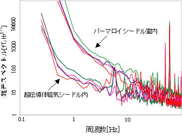 脳の神経電流がつくる磁場は地磁気の1億分の1程度と弱く、従来はパーマロイの磁気シールド室が用いられてきた。しかし、半径数キロメートル以内にいる電車や車の通行(鉄の固まりの移動)による環境磁気雑音は、0.1Hz付近にピークを持つ。BSCCOの高温相の超伝導磁気シールドは完全反磁性で、0.1Hz以下の超低周波でもシールド率が落ちない。同一のSQUIDセンサーを用いて、パーマロイシールドと超伝導磁気シールド内で測定した雑音スペクトルの比較を図2に示す。図に示したようにシールドの違いが1Hz以下で100倊以上の感度差を生むことがわかる。横軸を時間として64チャンネルのデータを比較するとその差は、もっと顕わである。これだけシールド特性に差があると、SQUID のプリアンプの1/f雑音、CMR、フィルター無しで動作可能な低ドリフト特性、電源のリップルなど、設計を零からやり直す必要がある。