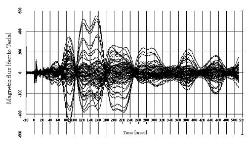 図3は、今度は横軸を時間として64チャンネルを同時に表示したものである。250 ms 以降の長潜時に 6 Hz のシータ・リズムが観測されている。特に、長潜時におけるシータ・リズム の振動の節の部分の媚びれが細いことは、この装置の低周波雑音が小さいことを端的に示している。正中神経刺激など単純な感覚刺激による脳磁界は一般には 250 ms ぐらいまでに終わってしまう。250 ms 以降の長潜時の信号は、第2体性感覚野などに現れ、脳のより高次の機能と関係している。長潜時に観測されるこれらの律動性後発射(rhythmic after-discharge) は、後脱分極(after-depolarization) か、後過分極(ahter-hyperpolarization)による。今後、長潜時の脳の機能を調べて視床・大脳皮質神経回路(thalamo-cortical network)についての研究が進むと予想される。