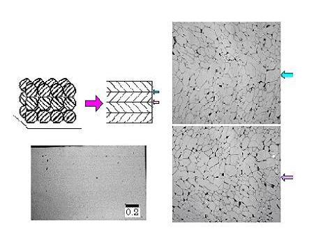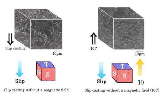 コロイドプロセスによる強磁場中配向において、用いるサスペンションは体積分率が大きいほど緻密な試料ができる。しかし、大きすぎても粘性が大きくなり配向しなくなるため、粘性が最も小さい30 vol%の条件でスリップキャストを行い強磁場中成形アルミナ(室温、10T)が作製された(図1)。スリップキャスト後1200、1600、2000°Cにおいてそれぞれ2時間空気中で焼成した試料についてX線回折により配向度が調べられており、焼成温度が高いほどは強く配向し、同時に相対密度も100%に近づく傾向を示すことが明らかになっている。しかしながら1200°C焼成では配向度、相対密度ともに低下するという。このことより粒成長と配向度はリンクしていることがわかり、粒径が配向度を決めていると述べられた。