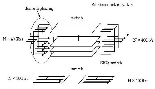 情報ネットワークはいまや水や電気のようなインフラと同様なものになりつつある。現在日本ではADSLの普及などにより飛躍的にトラフィックの増加が進んでいる。今後光ファイバの普及により、100Mbpsが各家庭に入る時代になれば、必要とされる基幹ルータの容量は数十Tbpsに達すると見込まれている。現在最大容量の半導体ルータのスイッチ容量は1Tbpsである。これまでルータのスイッチ容量は半導体LSIのクロック周波数の伸びに従って向上してきた。半導体のロードマップ(ITRS2003)に従い、これまでの傾向が続くと仮定すると、ルータ容量も5Tbps程度にとどまり、将来の需要を満たせない可能性が高い。 超電導工学研究所では、このような情報爆発を解決するブレークスルー技術としてSFQ技術のルータ技術への適用を研究してきた。通常のルータはラインカードとスイッチカードと呼ばれる部分から構成されている。ラインカード処理はパケット入力ポート毎になされ、いわば分散処理的な性格を持つが、スイッチカードは全てのラインカードからのIPパケットが集中する集中制御となる。スイッチカードは、回路の稼働率が高く、性能向上のため回路全体のクロックを上げることが難しい。最新のASICを採用しているが現在のスイッチカードのクロックは数百MHzに留まっている。このため、10Gbpsレベルのパケット処理においても、半導体技術では並列展開をとらざるを得ない。並列展開はハードウエア量の増大をまねき、総消費電力の増大と複雑化した実装により処理能力に限界がある。超電導工学研究所では、SFQ技術をスイッチカード、すなわちパケットスイッチに用いることを提案している。SFQパケットスイッチは数10GHzクロックで動作するので、並列展開の必要がなく、少ない回路で大量のデータが処理でき、ピンネックの問題からも解放される。図1にそのコンセプトを示した。
