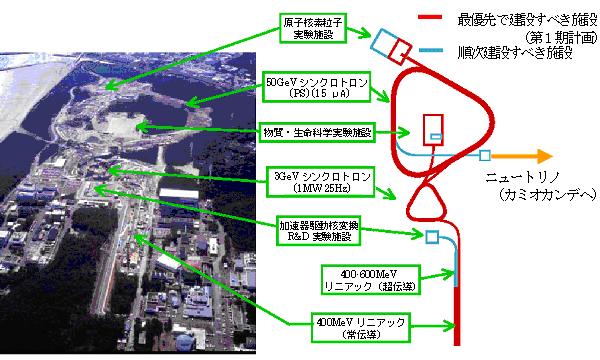 加速器の構成は図1(右)に示すように、400 MeVリニアック、3 GeVシンクロトロン、50 GeVシンクロトロンから成り、上流のビームが次の加速器に供給され、順次エネルギーを高めていくカスケード方式が採用されている。それぞれの加速器には、その出力に応じた利用施設が配置され、リニアックからの出力の一部は核変換実験施設、同様に3 GeVシンクロトロンでは物質・生命科学実験施設、50 GeVシンクロトロンでは原子核・素粒子実験施設及びニュートリノ実験施設に供給される。平成13年より加速器製作及び基幹設備の建設が開始され、現在の建設状況は図1(左)に見られるとおり大規模な建設が進められている。計画は第1期と第2期に分けられ、第1期では平成19年度を完成年度として各加速器と素粒子・原子核実験施設及び物質・生命科学実験施設が建設され、第2期ではリニアック出力の向上とニュートリノ実験施設及び核変換実験施設が建設される。しかし、ニュートリノ実験施設は早期立ち上げが決定され平成16年度より建設が開始された。