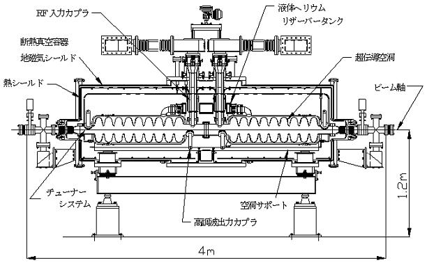 1) 陽子加速用超伝導空洞 超伝導加速空洞を用いた陽子リニアックは高い加速効率を実現できるため、加速器駆動核変換システム用陽子加速器として最も有望視されている。J-PARCでは、リニアックの高エネルギー部(400~600 MeV)に超伝導陽子リニアックを計画しており、ここで加速された陽子ビームは核変換実験施設に供給される。図2にJ-PARC超伝導陽子リニアックの基本構成要素となるクライオモジュールの概略図を示す。クライオモジュールは超伝導空洞を2台実装した真空断熱容器であり、空洞に高周波電力を供給するためのRF入力カプラ、共振周波数制御用チューナー、ビームにより誘起された高次モード高周波電力を外部に導くための高調波出力カプラ等を備えている。超伝導空洞は共振周波数972 MHz、9セル楕円型空洞であり、温度2 K、最大表面電界強度30 MV/m(加速電界強度10 MV/m)で運転される。J-PARC施設では11台のクライオモジュール及びビーム集束用四重極電磁石により超伝導陽子リニアックを構成する。ヘリウム冷凍機としては、4.5 K換算で約1.5 kWの規模となる。現在、クライオモジュール試作器の試験が進められており、超伝導空洞単体の性能として、最大表面電界32及び34 MV/mを実現している。